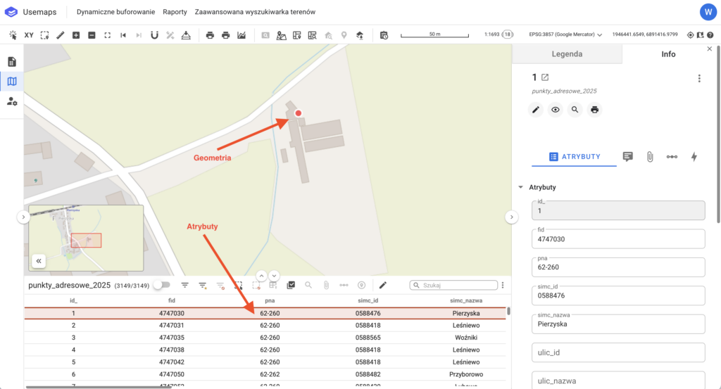 1. Geometry, which is the spatial representation. Different types of geometry are distinguished (point, line, and polygon).
