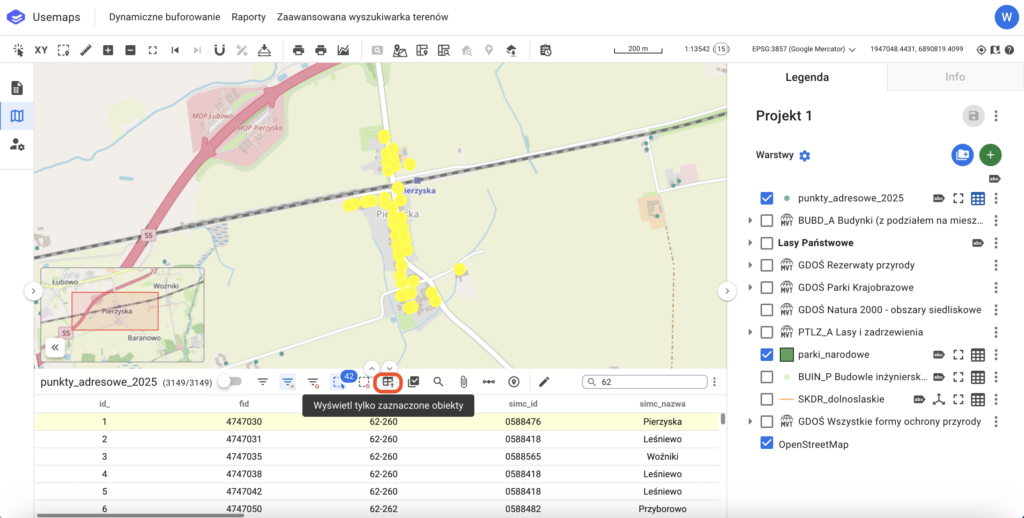 The tool is located in the Attribute Table and allows limiting the objects displayed in the table to only the selected ones.