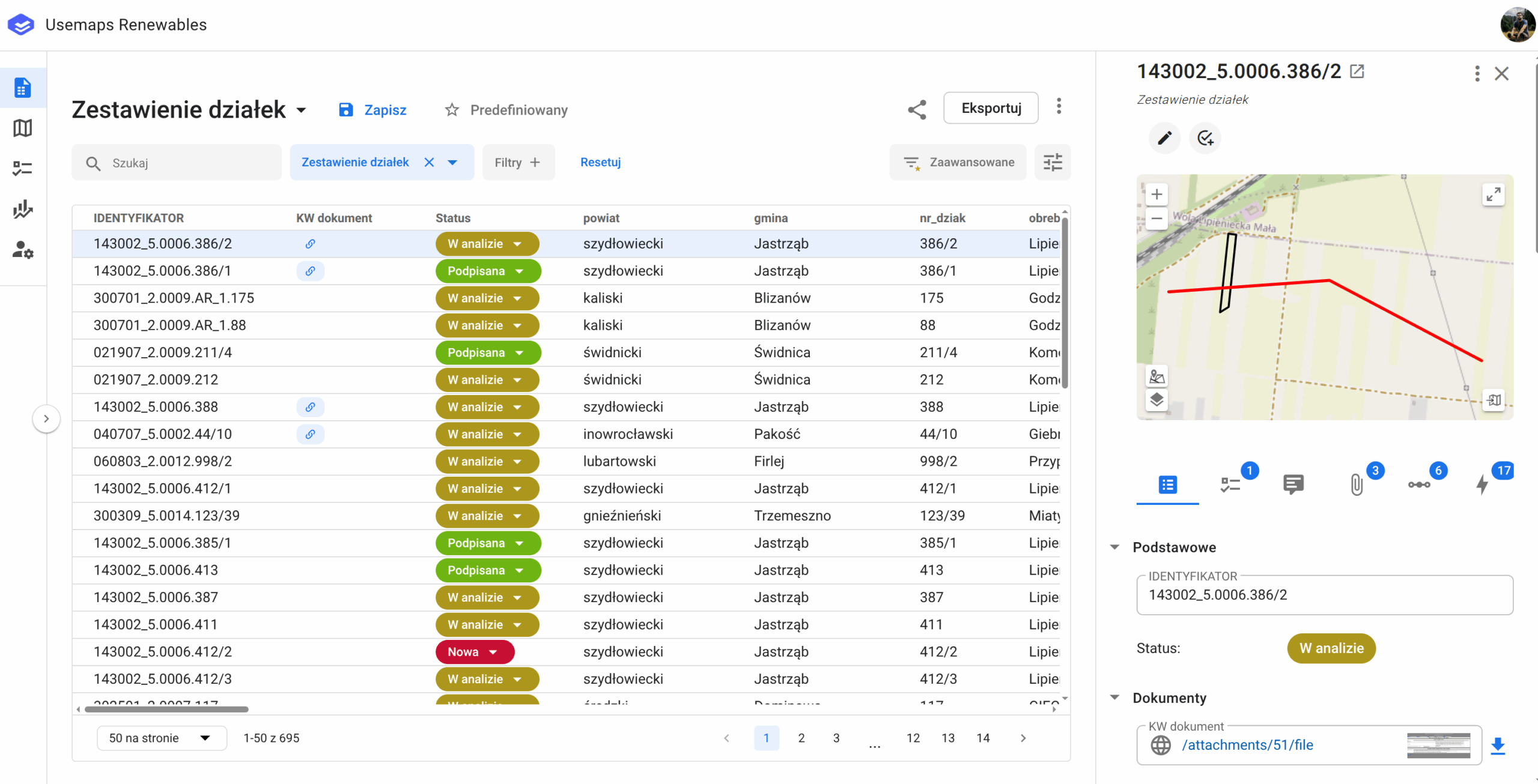Arkusze to możliwość przeglądania danych w postaci znanych i lubianych arkuszy, znanych choćby z Excela. Z tą różnicą, że po kliknięciu w wiersz pojawi się Karta Obiektu z małą mapą, atrybutami, listą zadań, komentarzy, załączników relacji oraz historią zmian.