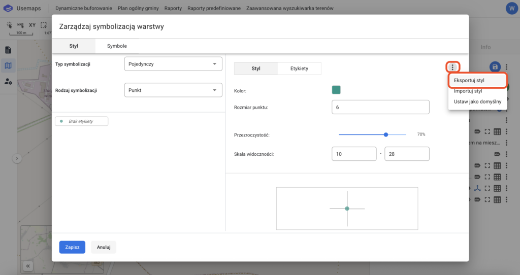 W celu zapisu stylu należy wybrać „trzykropek” i opcję Eksportuj styl. Plik z rozszerzeniem .style zostanie zapisany na dysku.