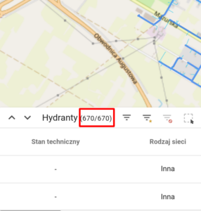 - Liczność obiektów wyświetlonych aktualnie w oknie mapy i tabeli atrybutów (może być różna w zależności od użytych filtrów)