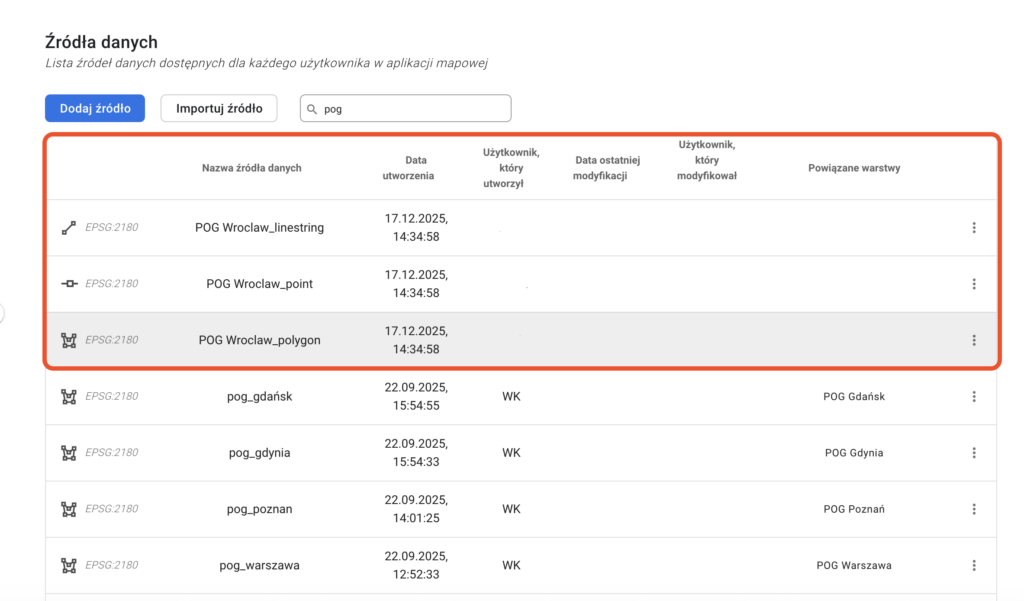 Podczas importu pliku tworzone są 3 Źródła Danych