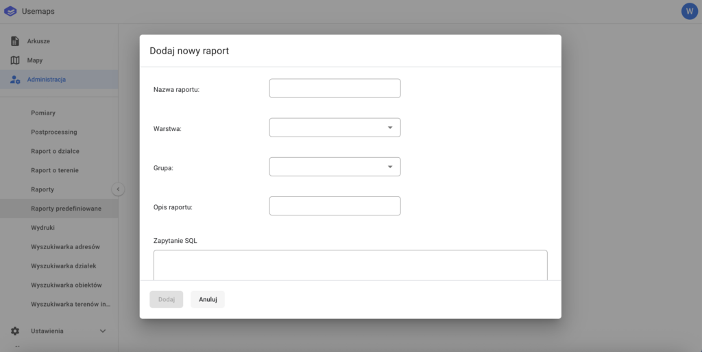 Raport jest definiowany za pomocą zapytania SQL, a jego wynik można pobrać do pliku PDF lub XLSX