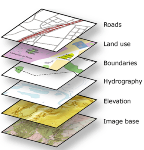 Mapa (kompozycja kartograficzna, wizualizacja) w GIS składa się z wielu warstw nałożonych na siebie,
