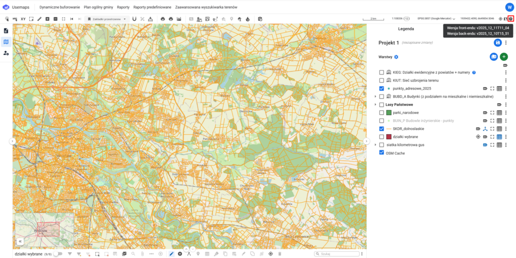 W celu sprawdzenia wersji Systemu należy najechać kursorem na znak zapytania w górnym prawym roku Panelu Mapowego.