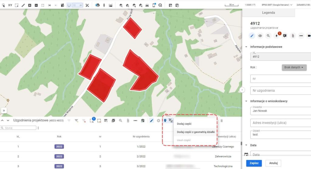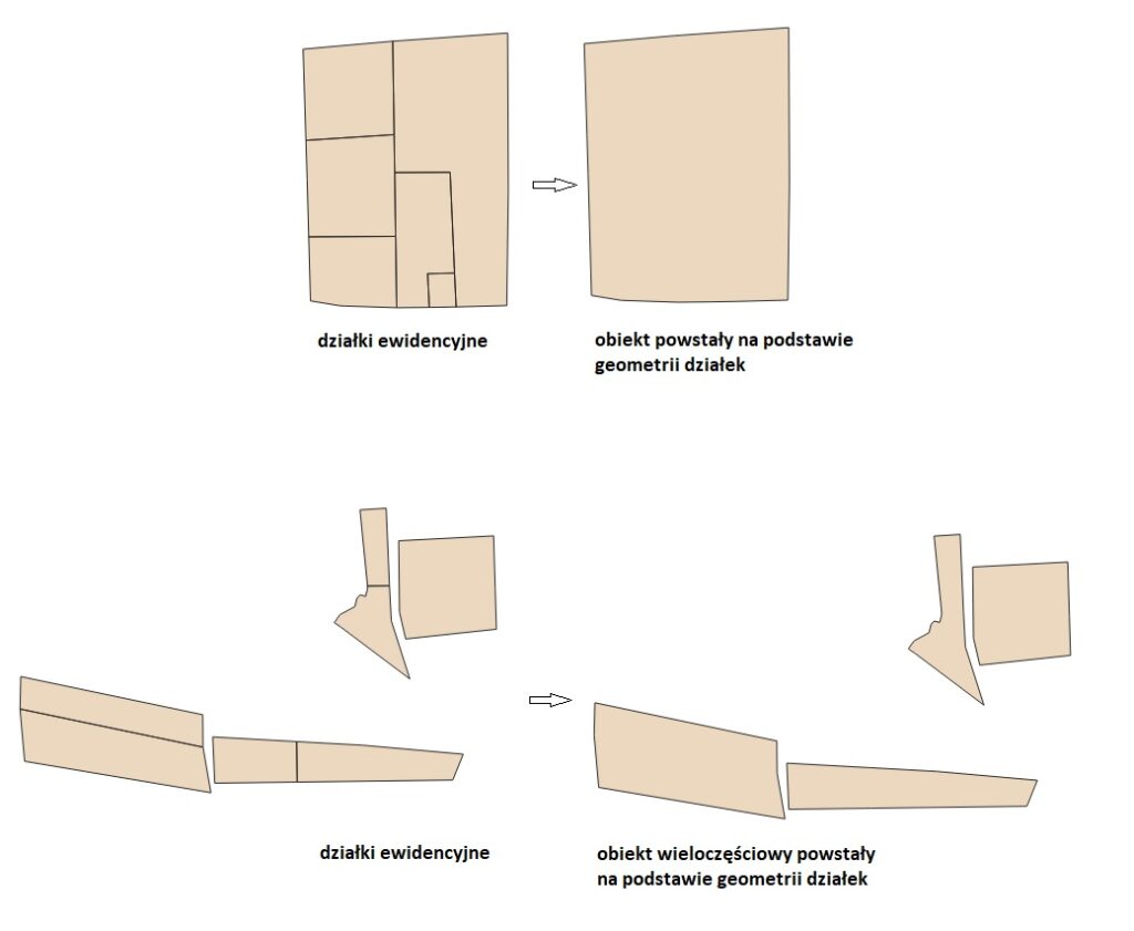 Narzędzie umożliwia stworzenie obiektu wieloczęściowego – w przypadku działek nie mających wspólnej krawędzi, lub jednoczęściowego, w przypadku działek sąsiadujących ze sobą.