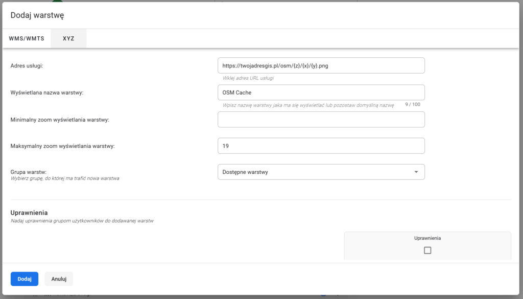 Warstwę XYZ OSM Cache dodaje do systemu Opiekun Klienta zgodnie z ustaleniami.