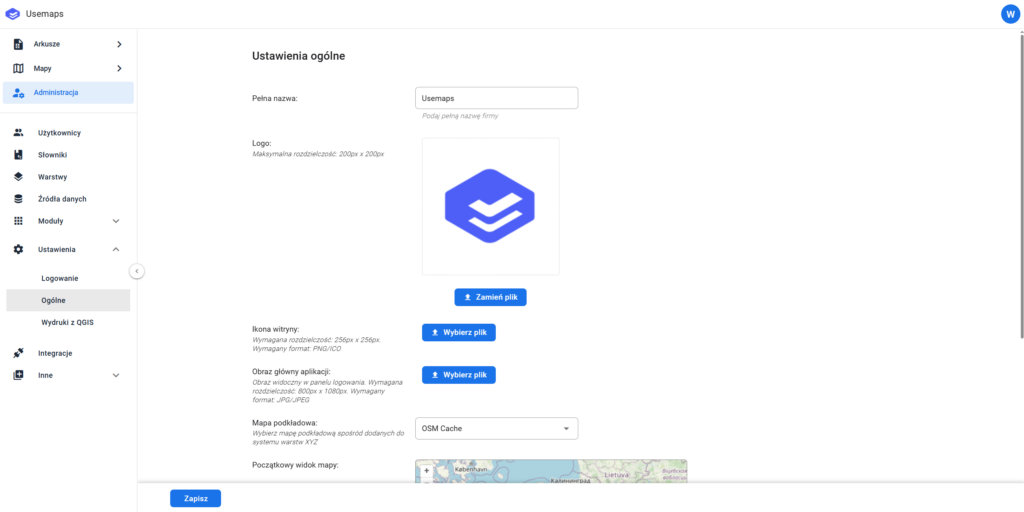 W zależności od preferencji administrator może dodać własny podkład mapowy XYZ, który będzie domyślny dla całej aplikacji. - Zmiana konfiguracji następuje w Panelu administracyjnym -> Ustawienia -> Ogólne -> Mapa podkładowa