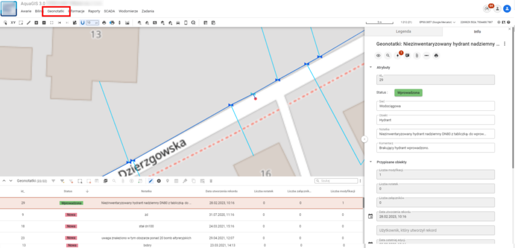 4. Następnie użytkownik Systemu, który dba o aktualność sieci, po otrzymaniu informacji od pracownika w terenie dodaje w warstwie Hydranty kolejny obiekt, wg informacji z Geonotatki i zmienia jej status z nowej na wprowadzoną.